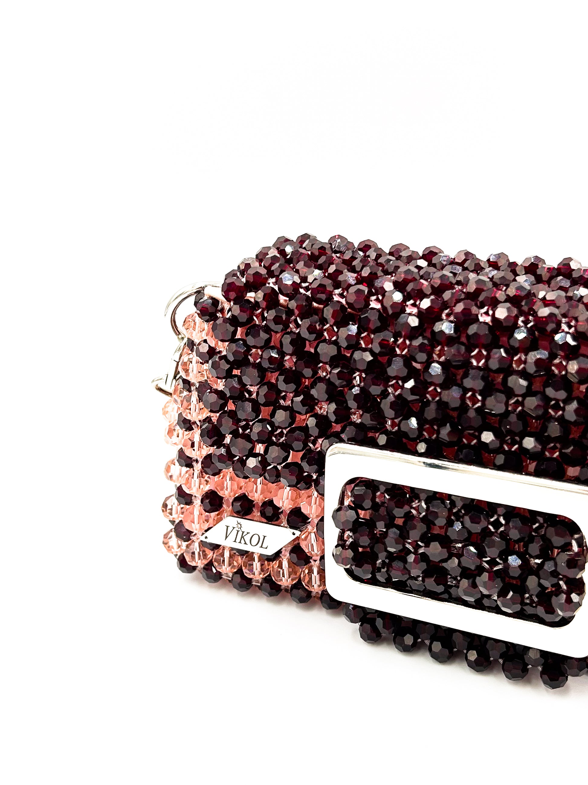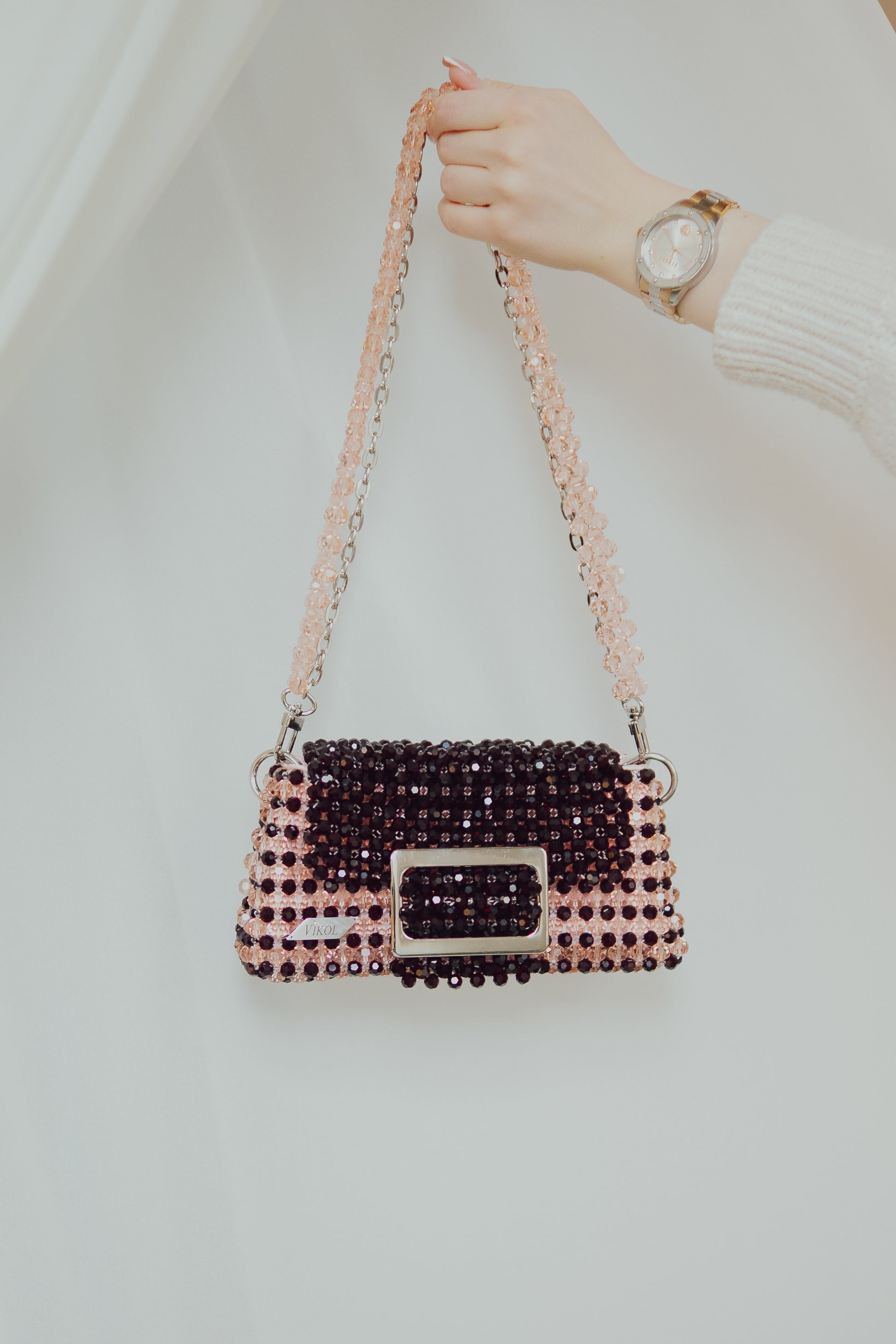Torebka została wykonana ze szklanych, fasetowanych koralików, które pięknie odbijają światło, tworząc subtelny, elegancki blask. Wnętrze wykończone jest w 100% naturalną bawełną, ozdobioną satynową lamówką, która dodaje całości wyrafinowanego charakteru. Całość uzupełniają trwałe karabińczyki wykonane ze stali nierdzewnej.