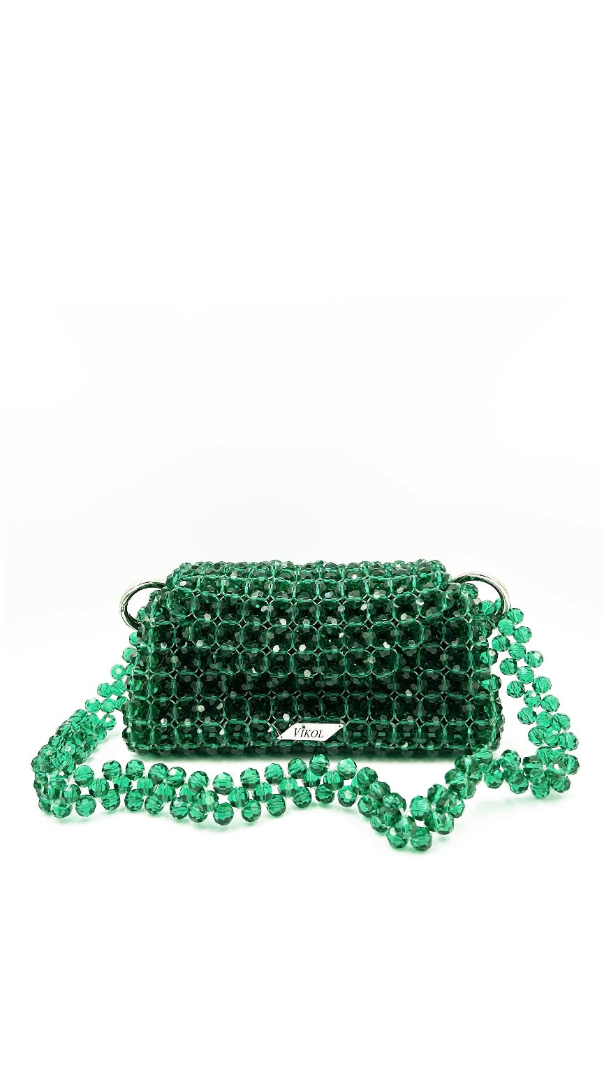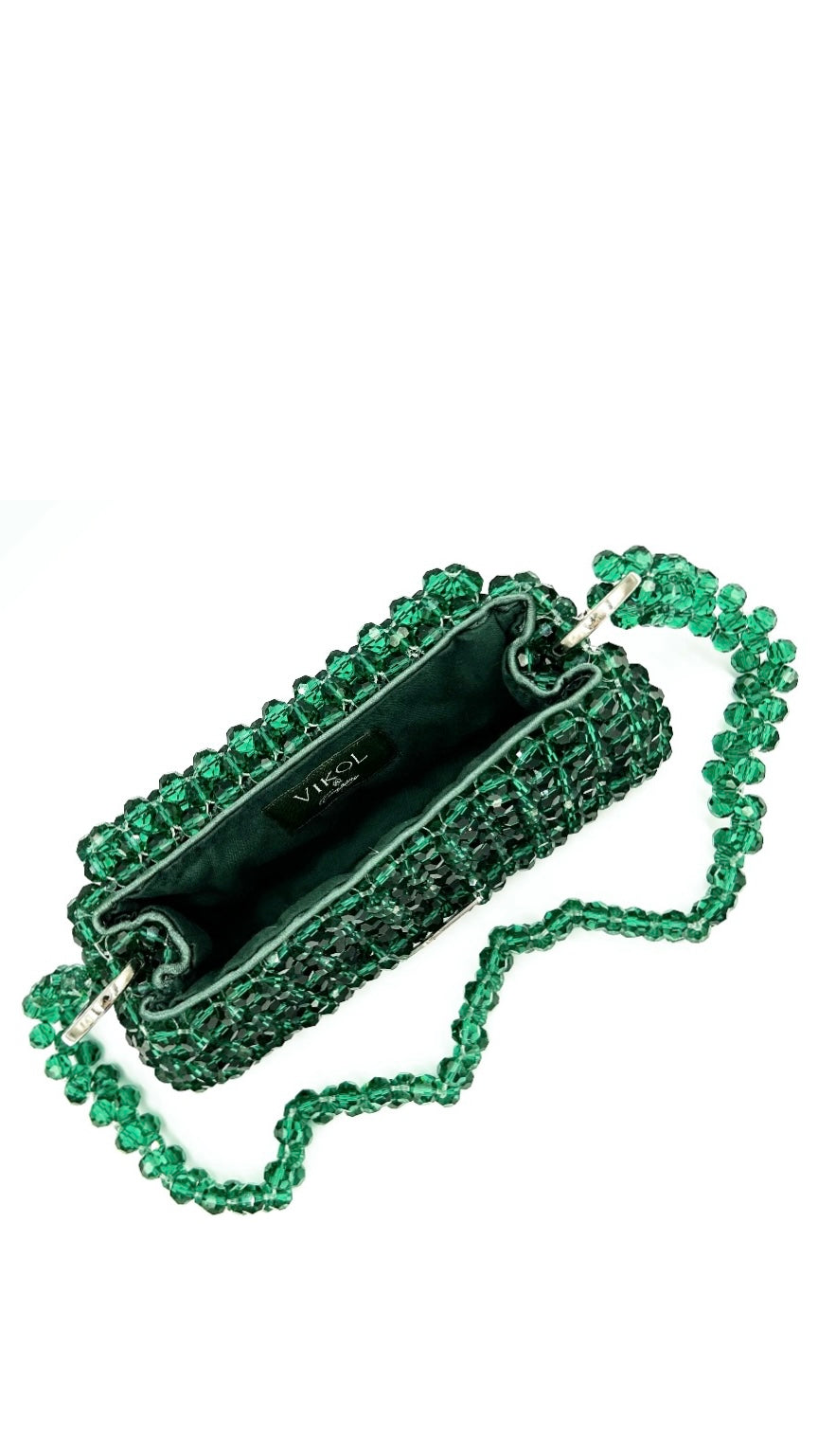 Torebka została wykonana ze szklanych, fasetowanych koralików, które pięknie odbijają światło, tworząc subtelny, elegancki blask. Wnętrze wykończone jest w 100% naturalną bawełną, ozdobioną satynową lamówką, która dodaje całości wyrafinowanego charakteru. Całość uzupełniają trwałe karabińczyki wykonane ze stali nierdzewnej.