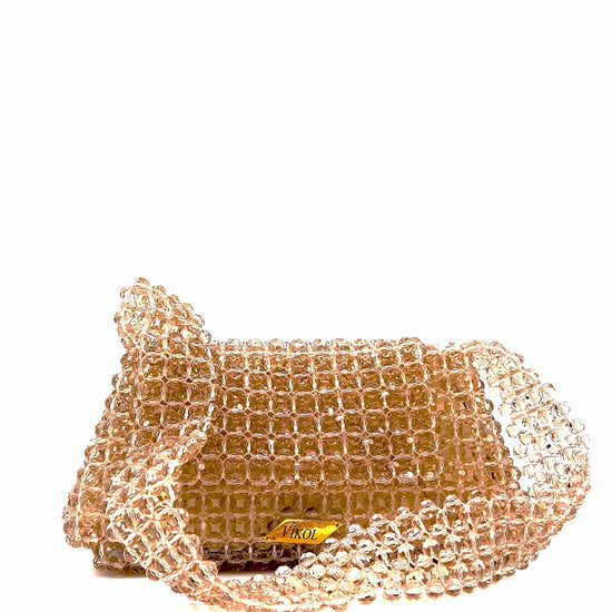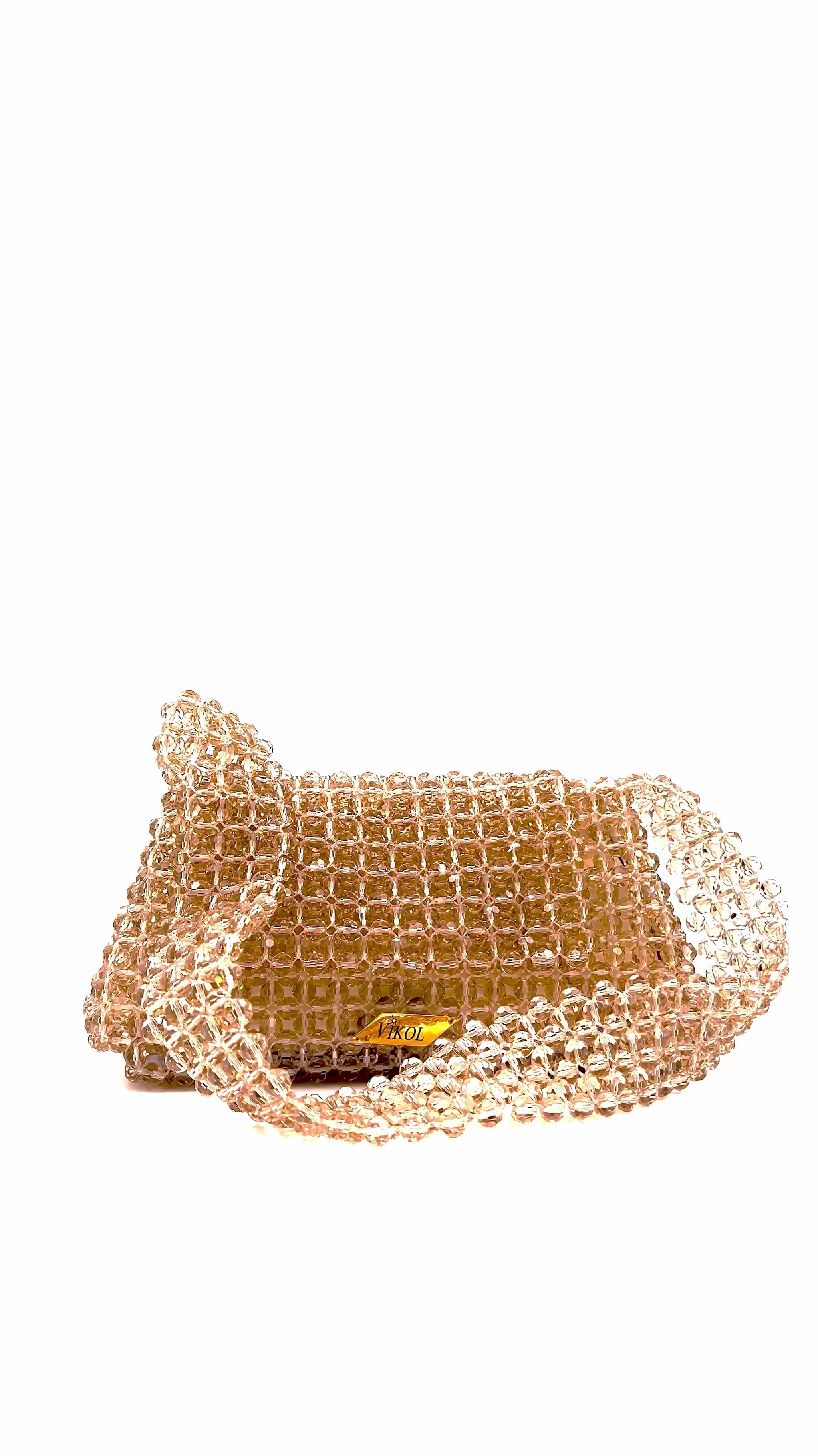 Torebka została wykonana ze szklanych, fasetowanych koralików, które pięknie odbijają światło, tworząc subtelny, elegancki blask. Wnętrze wykończone jest w 100% naturalną bawełną, ozdobioną satynową lamówką, która dodaje całości wyrafinowanego charakteru.